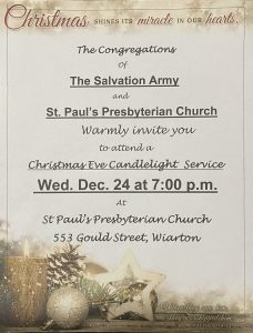 The congregations of The Salvation Army and St. Paul’s Presbyterian Church warmly invite you to attend a Christmas Eve Candlelight Service on Wednesday, December 24th at 7:00 PM at St. Paul’s Presbyterian Church – 553 Gould Street, Wiarton.